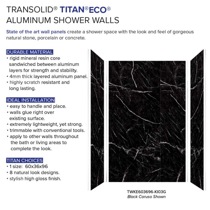 Perfect for new construction or a refreshing remodel, Transolid Titan Shower Walls add a luxurious natural stone look to any area of your home. Customize your space by using our versatile walls in your shower, bathroom, or laundry room, as accent pieces, or as kitchen backsplash. Make your design dreams come true without the hassle; Transolids lightweight walls glue right over existing surfaces for a quick and easy installation. Choose Transolid and let the easy to clean, water and scratch resistant walls simplify your life for years to come.