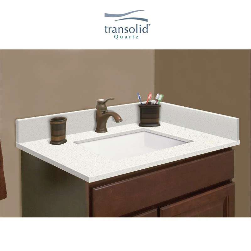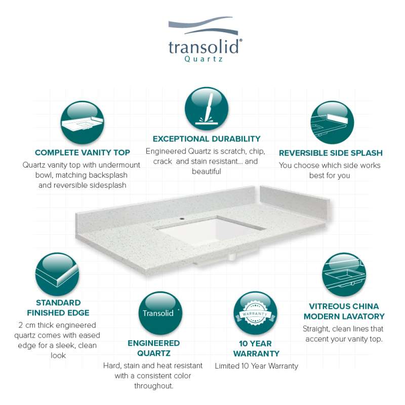 They say home is where the heart is - so why not create a special place to enjoy for years to come? With Transolid quartz vanity tops you'll experience a captivating and energizing color palette. Quartz is a nonporous surface that prevents unwelcome germs, bacteria, and mildew. Easy to maintain and clean. Lustrous surface that doesn't require sealing, conditioning or polishing and is scratch, heat, and stain resistant. Each Transolid quartz vanity top includes reversible sidesplash and loose backsplash.